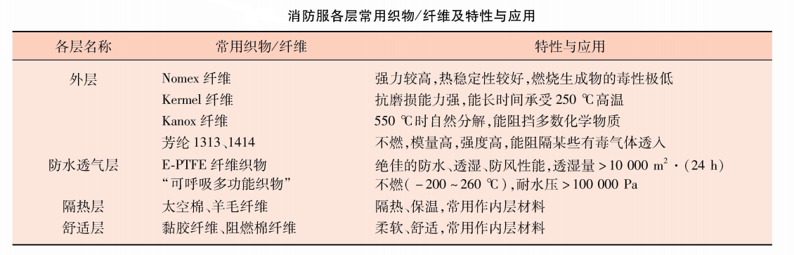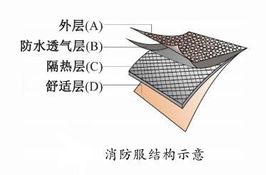 消防服由外层(A )、防 透 气 层 (B )、隔热层 (C)、舒适层(D)等层复合而成。阻燃性是外层 的基本要求;防透气层的作用主要是防或有害物质渗入,并将人体产生的汗液和湿气及时排出;隔热层要求具备良好的隔热、防热辐射性;舒适层提供与人体接触的舒适性。多层织物复合形成消防服,需提供的主要性能是整体热防护性、透水蒸气性和舒适性。