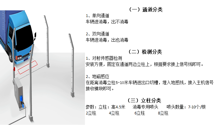 车辆消毒通道主要用途是为预防及防治流感、口蹄疫、霍乱、流行性疾病等病毒病菌的传播,扩散,需要在消防站、防疫站、省道、国道、高速公路、城乡交接处、出入境检疫站、无害化处理中心等处对货物运输车辆、消防车辆及其它进出通行的车辆进行彻底的消毒,防止车辆外表面带来的病原体扩散传播,达到进出车辆防疫消毒目的。本消毒通道在消毒方式上采用高压冲击喷雾技术,符合SN/T1333-2012《入出境汽车及其他车辆消毒规程》标准要求。